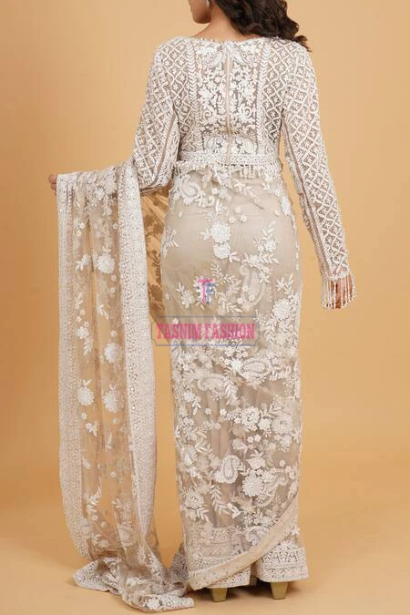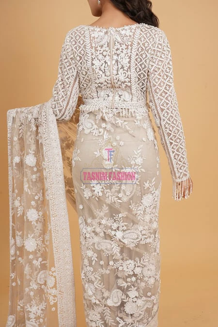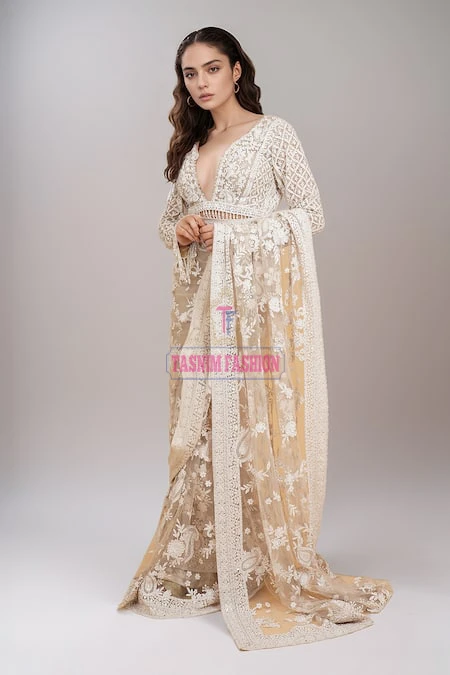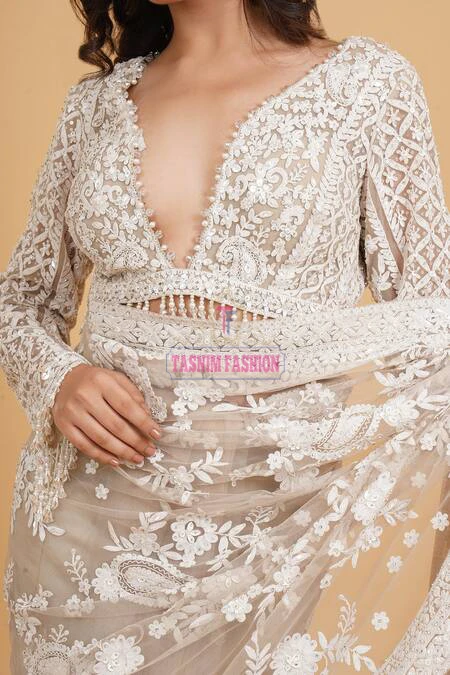 Work: Hand Embroidered Ari Floral Plunged Nouka Chumki Pearl Sequence Work